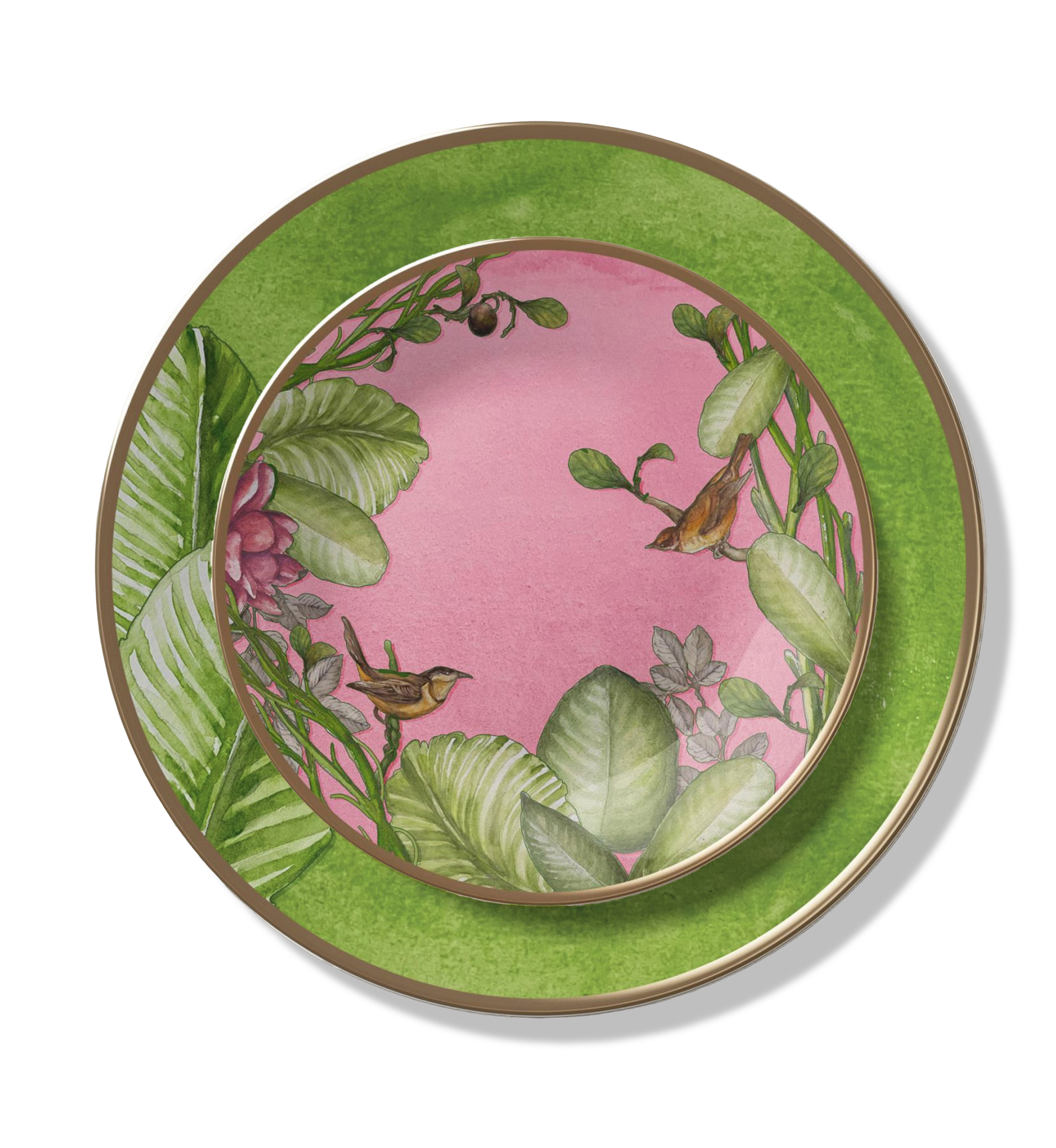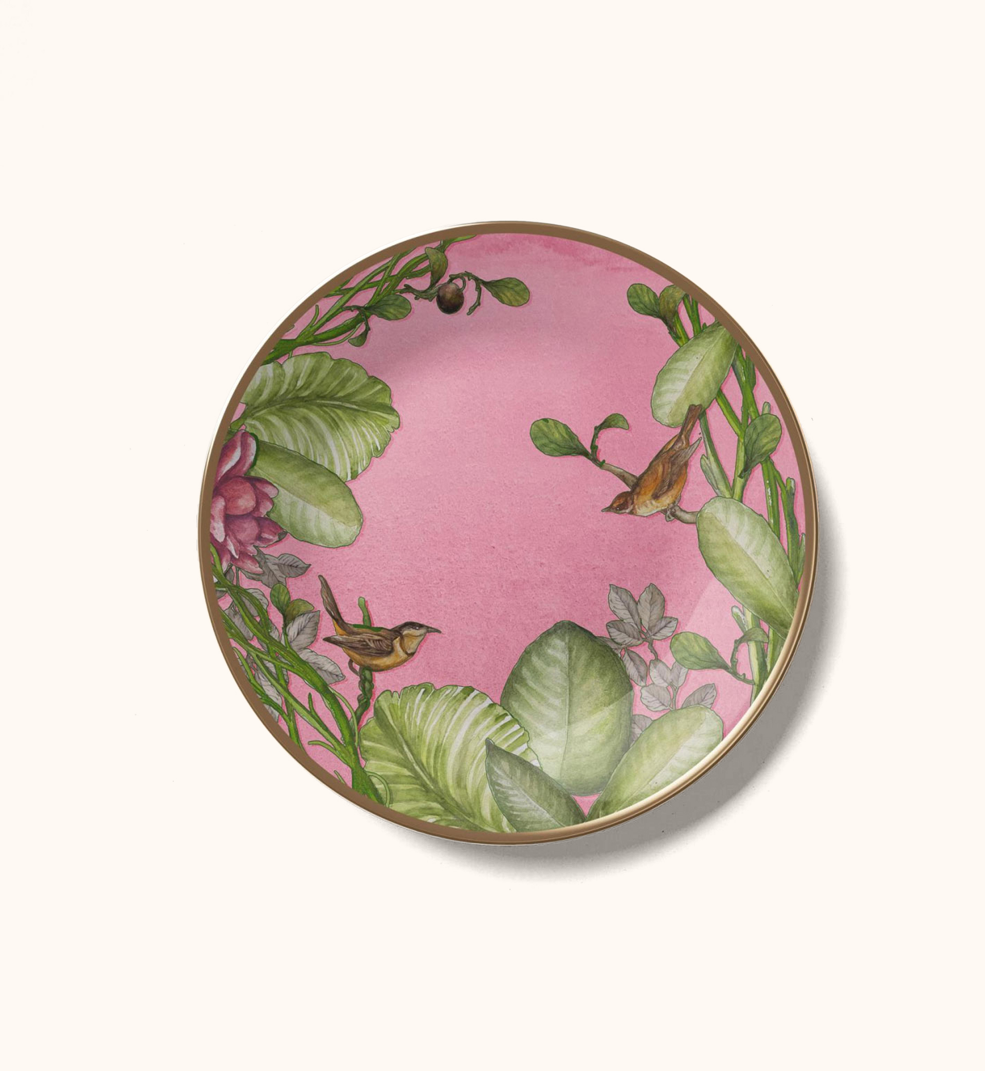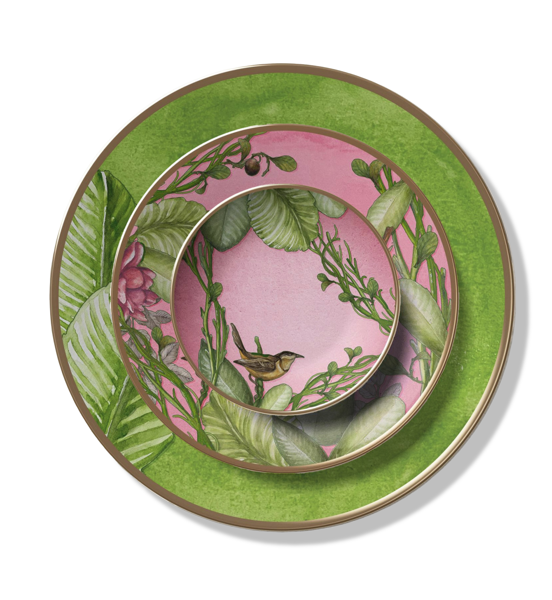 Descubra a sofisticação da Coleção Lan. Inspirada na delicadeza da natureza, cada peça em porcelana traz ilustrações em aquarela de pássaros, flores e folhagens tropicais, realçadas pelo acabamento em dourado. O contraste entre o fundo rosa vibrante e o verde exuberante cria composições únicas, transformando qualquer mesa em uma verdadeira obra de arte.