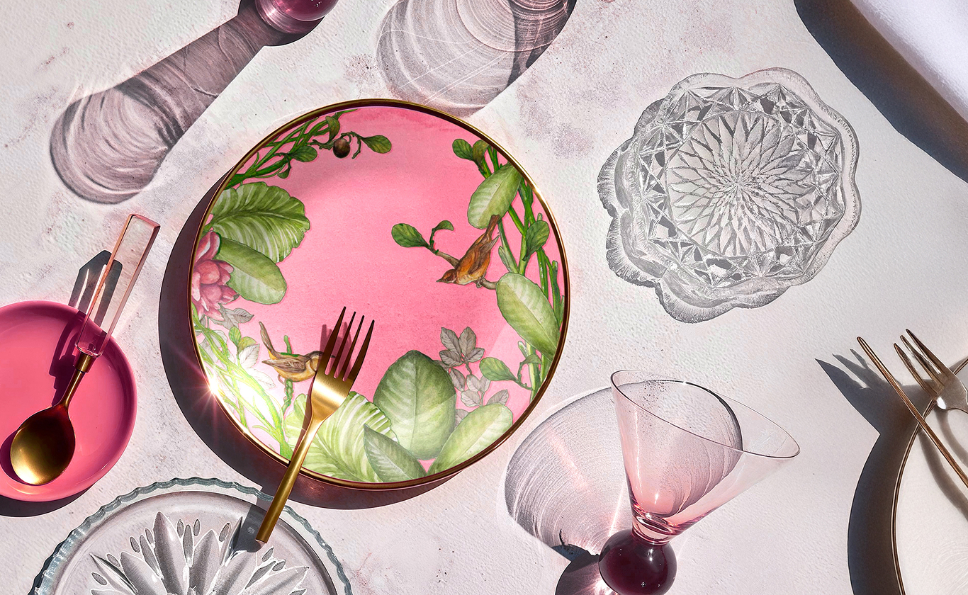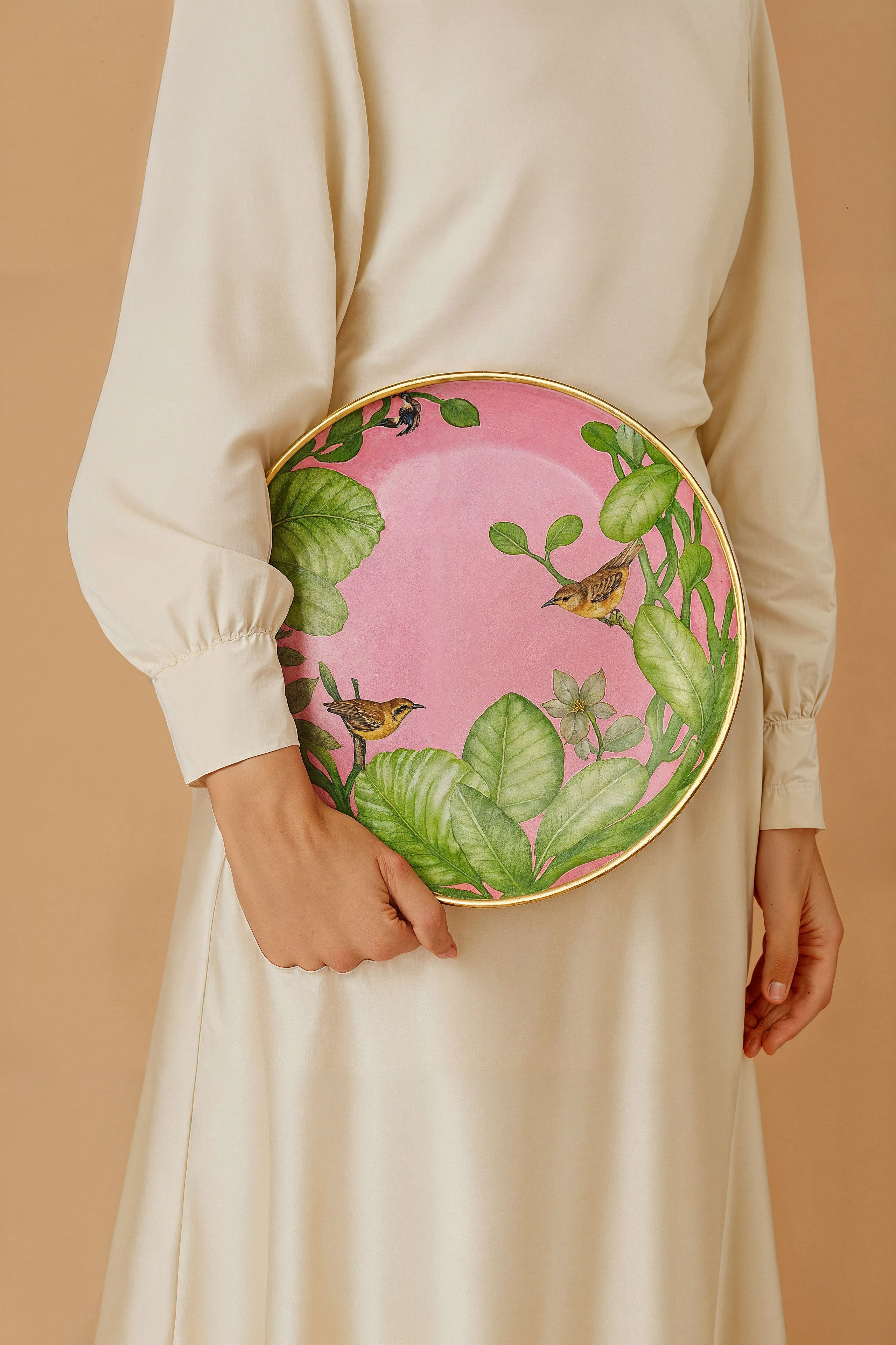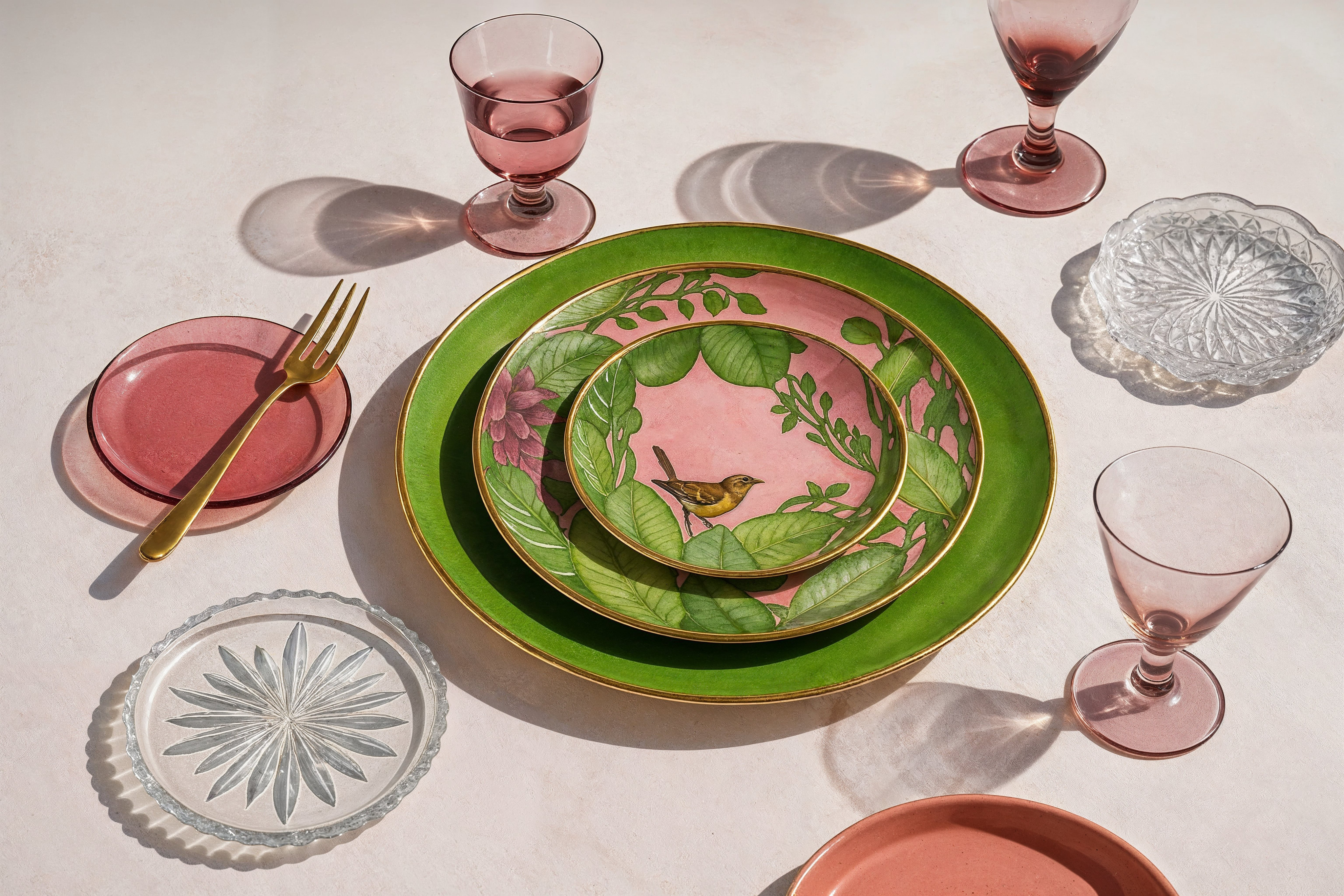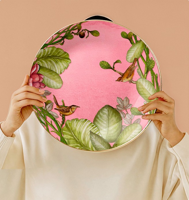 Descubra a sofisticação da Coleção Lan. Inspirada na delicadeza da natureza, cada peça em porcelana traz ilustrações em aquarela de pássaros, flores e folhagens tropicais, realçadas pelo acabamento em dourado. O contraste entre o fundo rosa vibrante e o verde exuberante cria composições únicas, transformando qualquer mesa em uma verdadeira obra de arte.