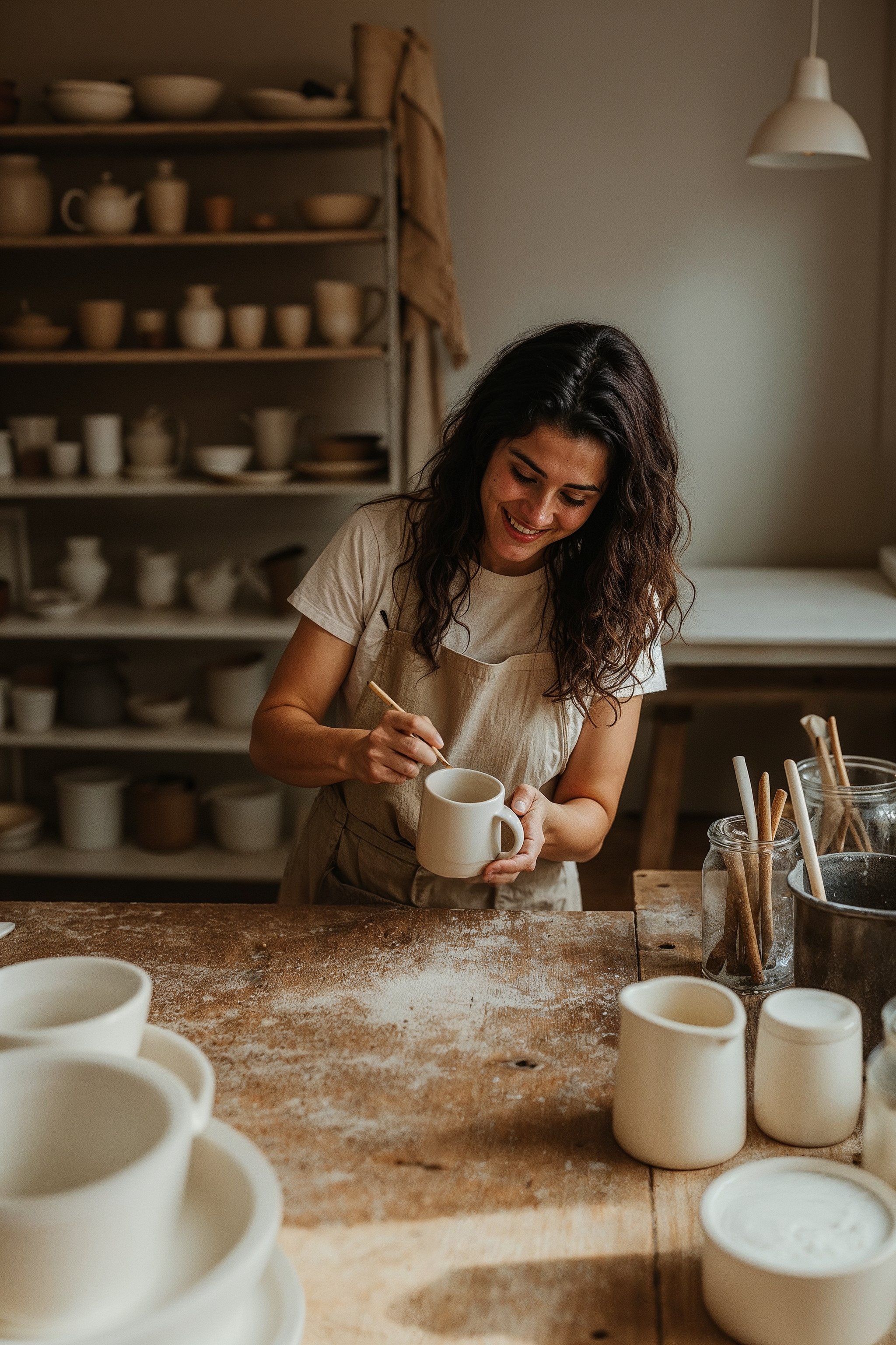 O processo criativo é guiado pelo olhar de quem enxerga a porcelana como tela. A ideia nasce em esboços que lembram estudos de um pintor diante da tela em branco. Na modelagem, as formas ganham corpo como esculturas em miniatura.A queima revela a resistência e a transparência da matéria, enquanto os acabamentos — pinceladas, relevos, dourados — trazem a assinatura da artista, em cada detalhe.O clássico se encontra com o novo: a técnica milenar da porcelana ganha frescor contemporâneo, revelando peças que são ao mesmo tempo memória e presente.
